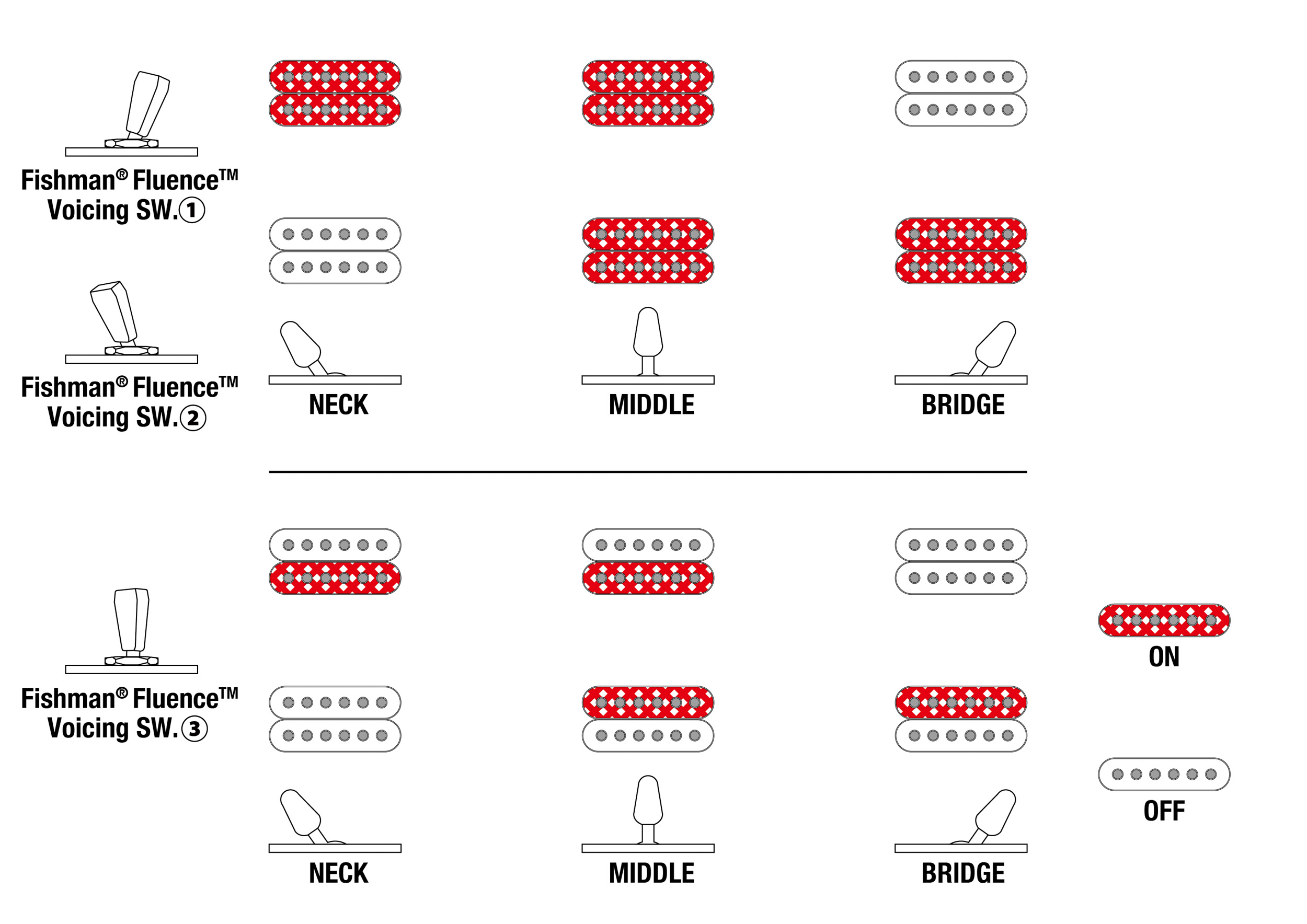 Alpha är utrustade med Fishman Fluence Modern humbuckers, ett helt nytt sätt att göra mickar på.