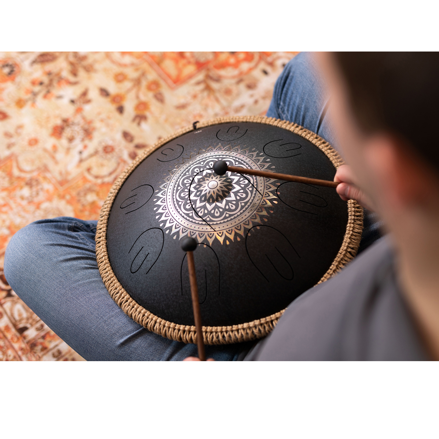 toner vardera som levererar en ton i två oktaver. Detta skapar ett underbart, meditativt ljud som påminner om en handpan.På botten på trumman finns ljudhålet som kan