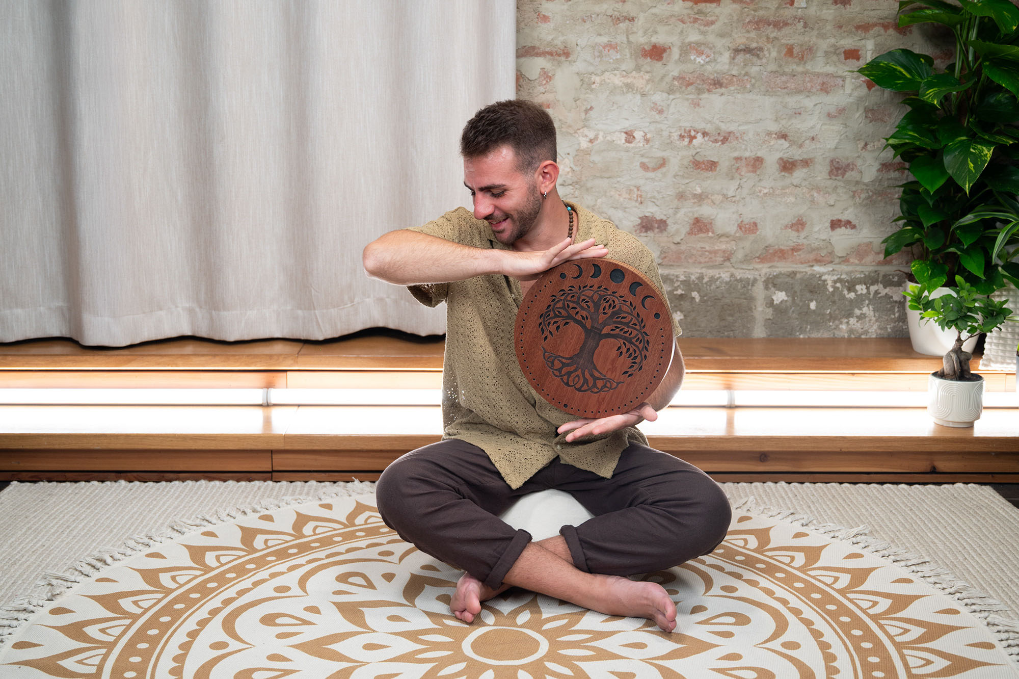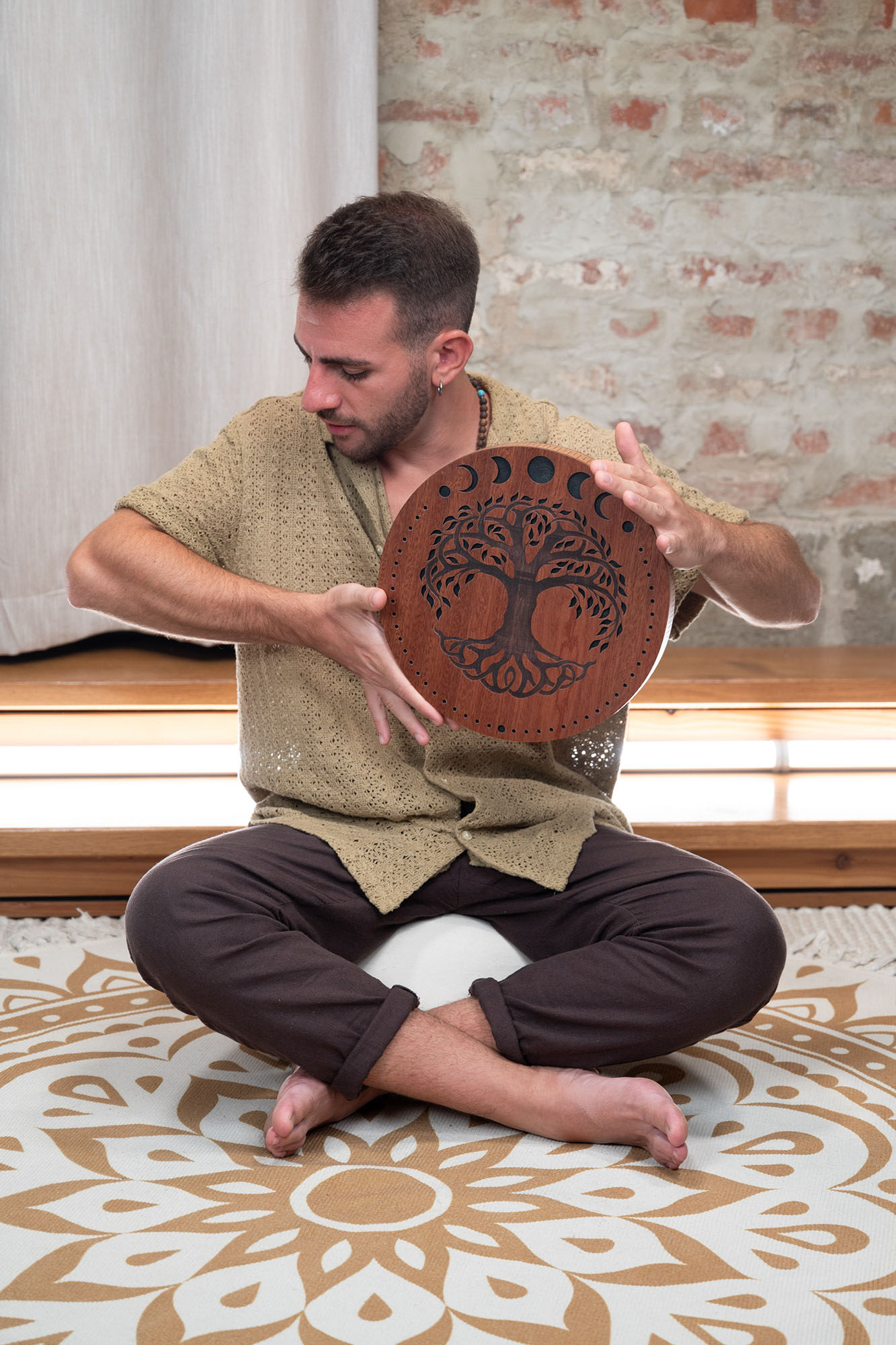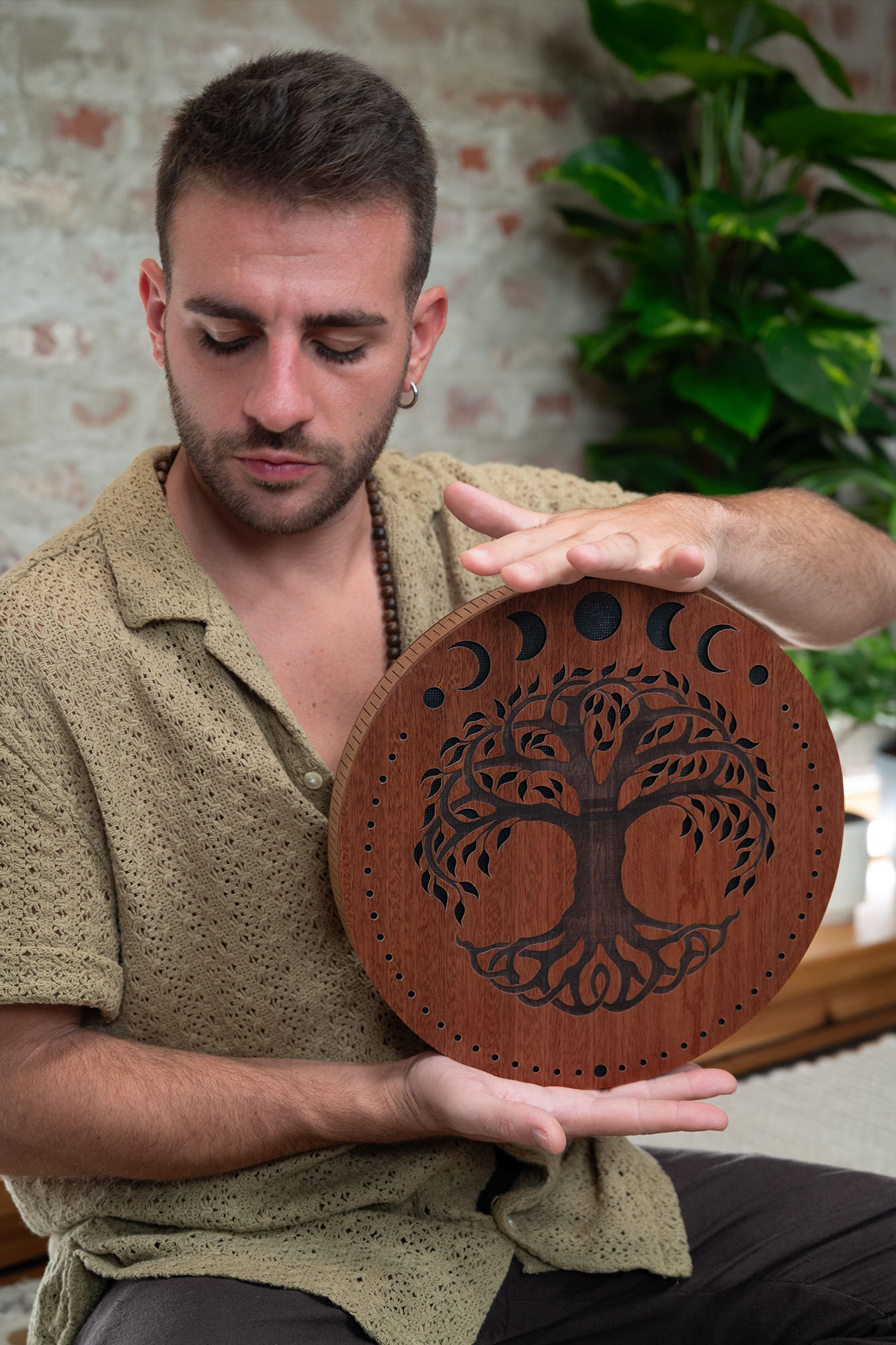 Meinl Sonic Energy Rain Discs är vackert snida, lätta instrument som återskapar det lugnande ljudet av rinnande vatten. Genom att försiktigt rotera dem med båda händerna, som ett snurrande hjul, sätter du de inre elementen i rörelse och skapar en lugnande, naturlig vatteneffekt. Den enkla handlingen att spela ? att känna rörelsen och fokusera på ljudet ? är meditativ i sig, vilket gör Rain Discs perfekta för avslappning, ljudterapi och medvetna musikaliska stunder. Varje Rain Disk levereras med en mjuk väska för skydd och ett trästativ för elegant display.