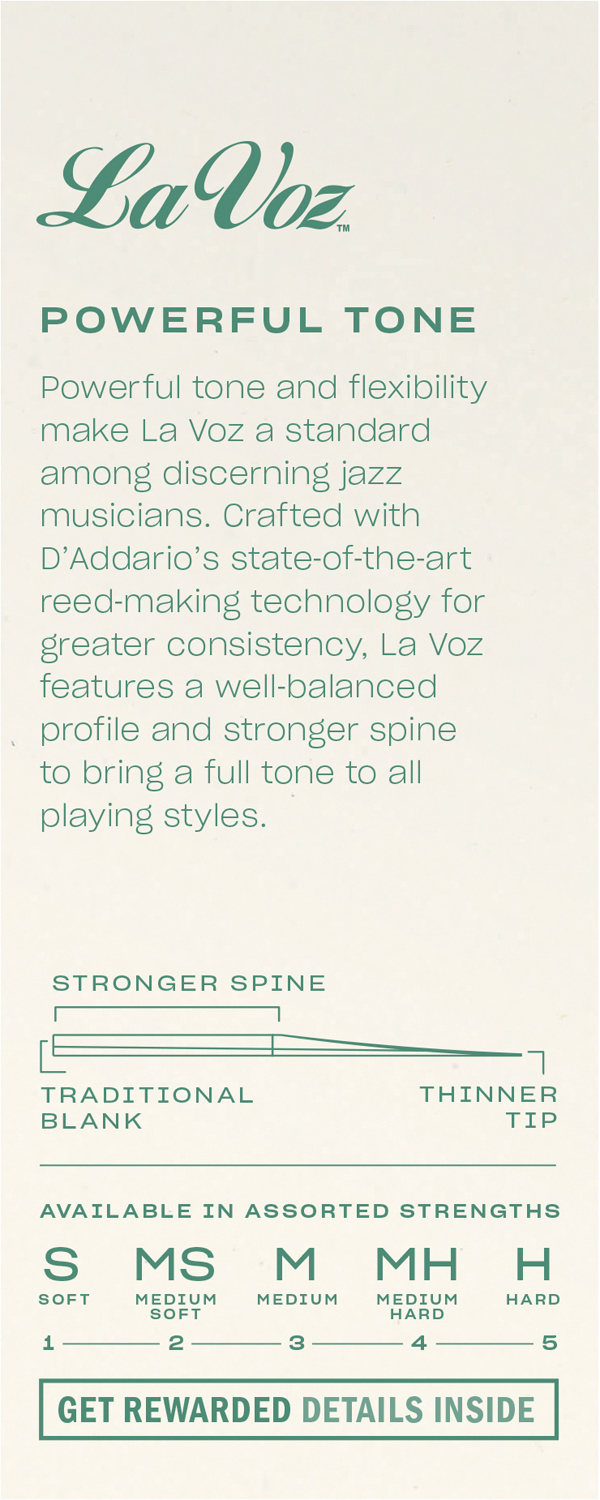 Jazzmusiker väljer La Voz rörblad för dess flexibilitet och kraftfulla ton. La Voz rörblad är tillverkade med D'Addarios sofistikerade produktionstekniker, med en välbalanserad profil och en starkare ryggrad för att ge dig en full ton, oavsett din spelstil.
