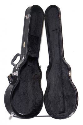 Formetui av plywood, för semi-acoustic elgitarr, klätt i svart galon, plyschfodrat.