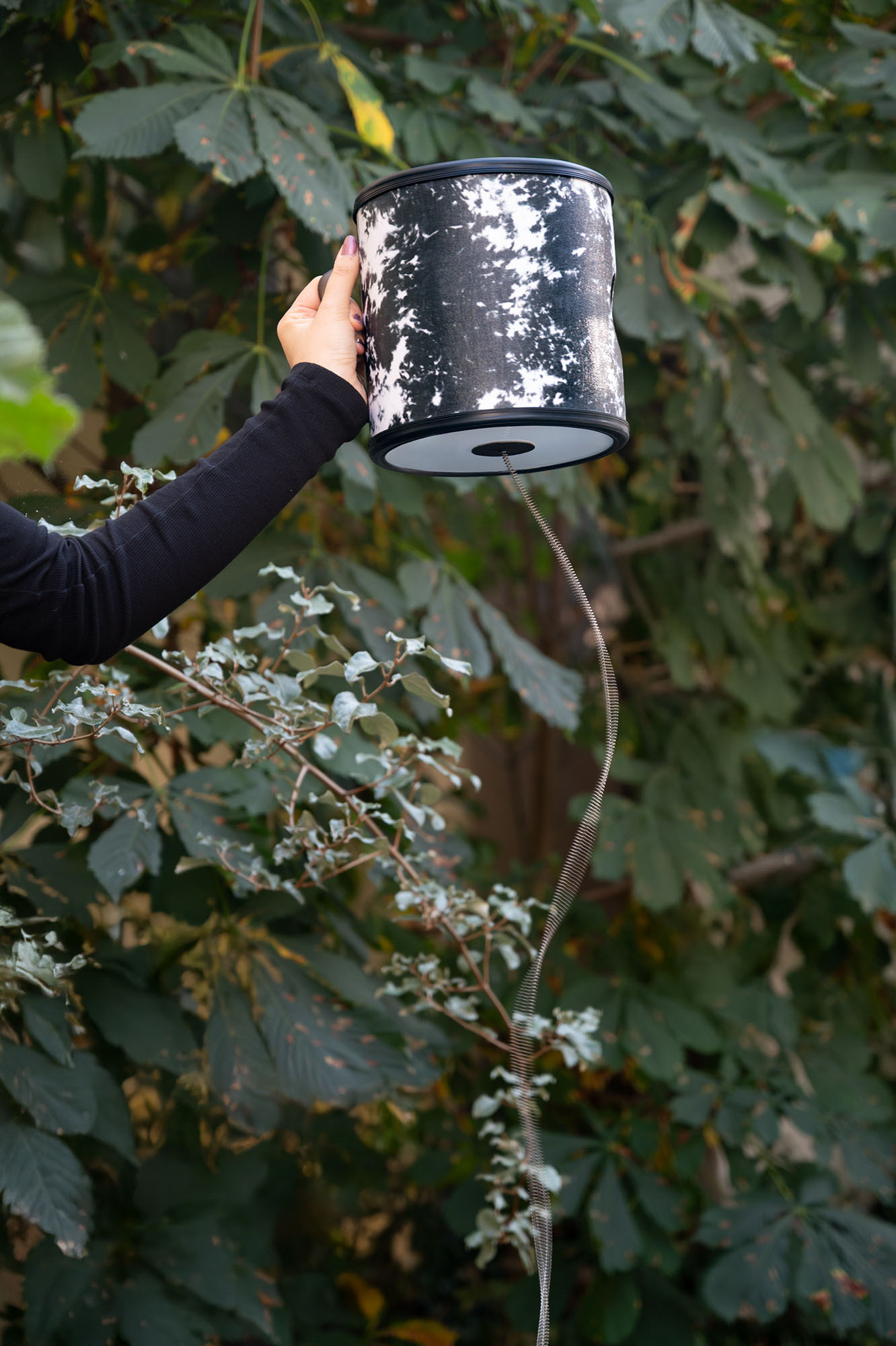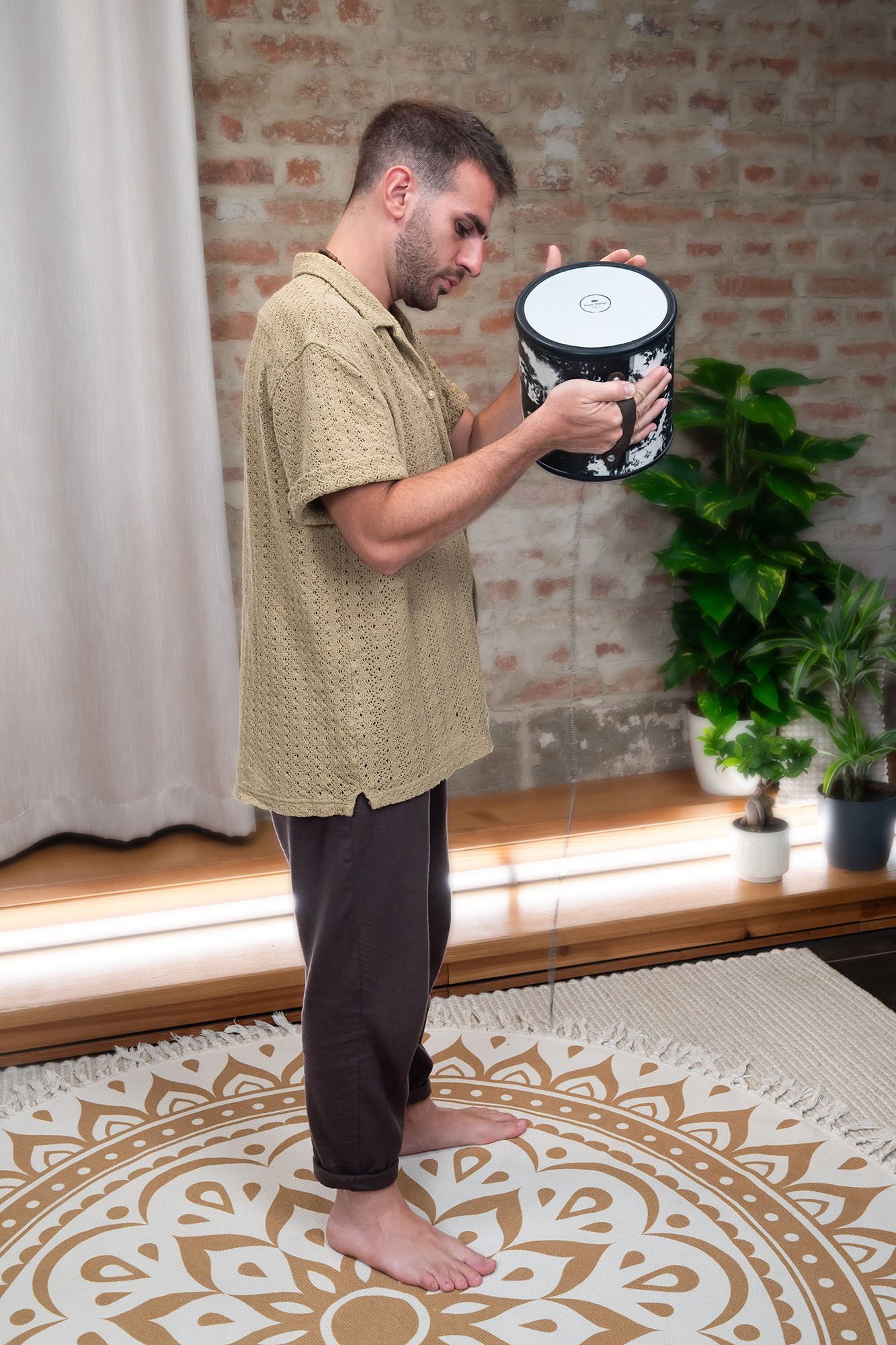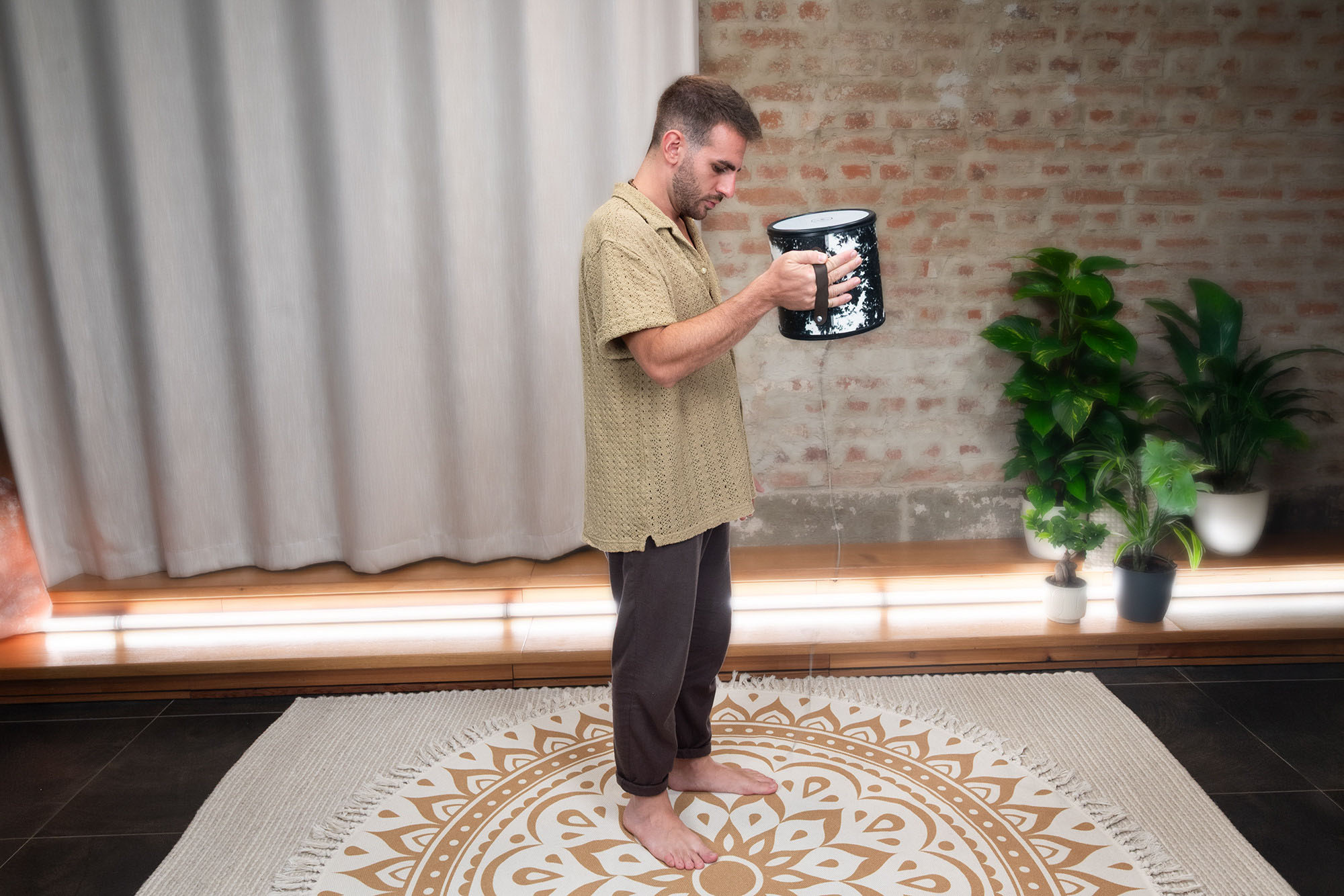 Att knacka på fjädern med handen skapar skarpa, fräsande accenter. Att öppna och stänga ljudhålet ger ytterligare variationer, inklusive uttrycksfulla wah-wah-liknande toner. Perfekt för ljudresor där naturliga atmosfärer spelar en viktig roll, liksom för framträdanden eller kreativ ljuddesign.
